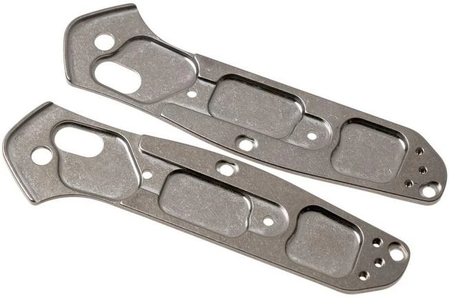 These Flytanium Benchmade 945 Mini Osborne Scales are great aftermarket accessories for the Benchmade 940 Osborne. They are well-fitting scales made by the experts at Flytanium. The great thing about these scales is that Flytanium didn’t simply stick to the outer edge of the old scales, and just left it at that. No: there is also a bevelled finger groove for your index finger. And the holes that, for the original pocket knife, are enhanced with a D-shaped hole to prevent the screws from rotating are also nicely shaped like a D with these scales. Not all after-market scales have this!