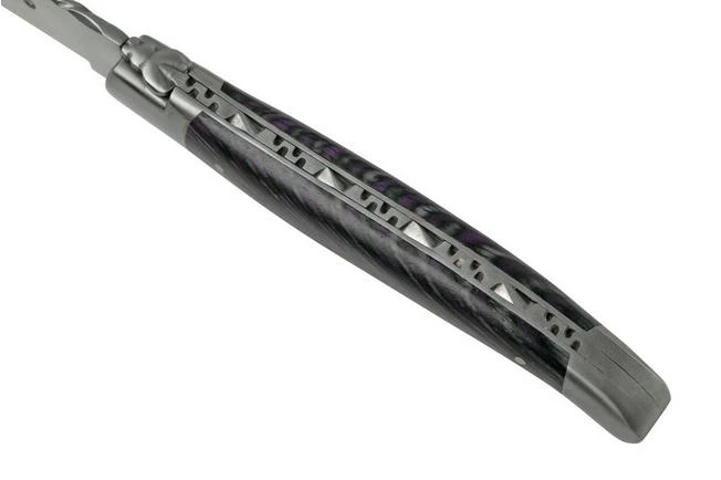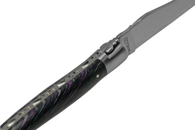 The Laguiole en Aubrac Samba Prune is a modern version of the classic Laguiole knife. The knife has a purple handle and a matted bolster and edge. This pocket knife is handcrafted to guarantee a refined finish.