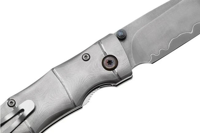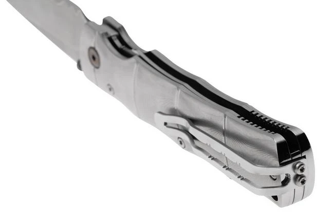 The Mcusta MC-0202G Shinra Maxima Takeri is a large and stylish Mcusta pocket knife. Perfect for anyone who prefers slightly larger gentleman’s knives. The stunning damascus steel handle stands out. It is enhanced with what Mcusta calls a bamboo pattern. This means, quite literally, that the handle is shaped like a piece of bamboo. It doesn’t only look great, it also offers enough grip.