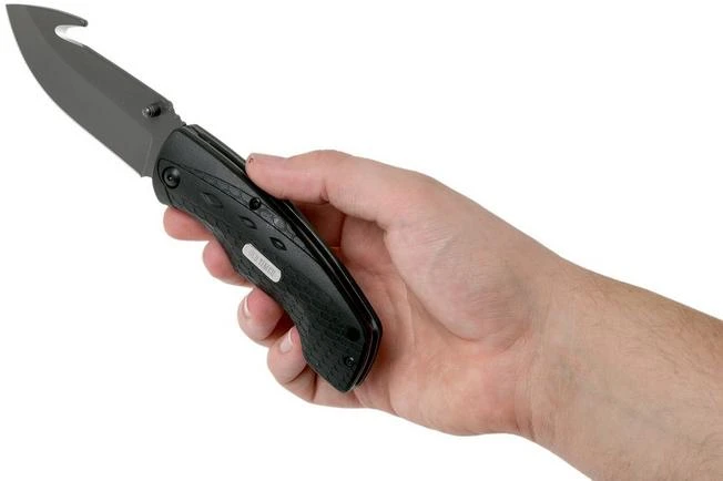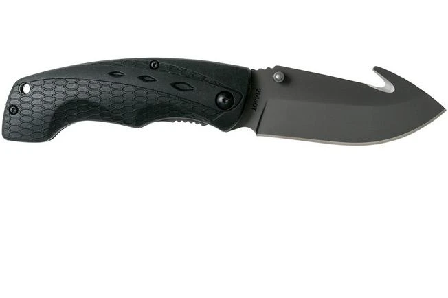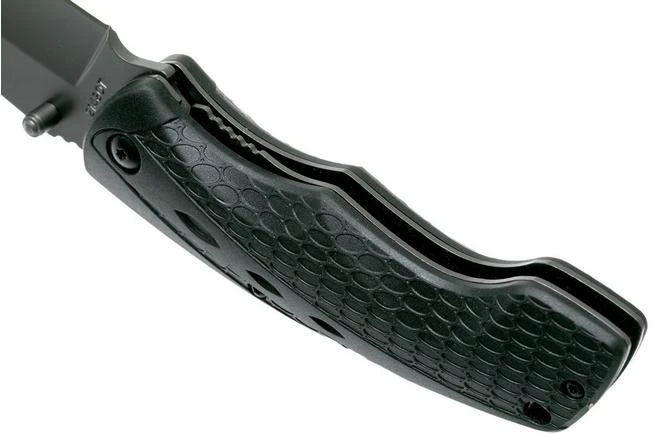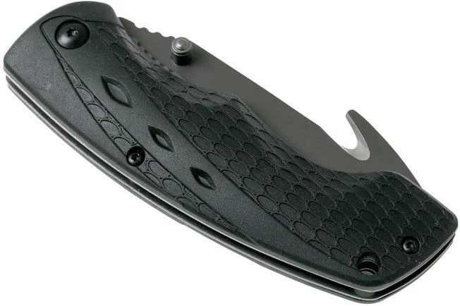 The Old Timer Copperhead Drop Point Folding Knife 2148OT is an affordable pocket knife, with a rubber handle that offers plenty of grip. The scales have a snakeskin-like texture, which is where the knife gets its ‘Copperhead’ name. You can open the knife one-handed with the double thumb stud. When opened, the blade is locked by a solid liner lock. Think of it as a modern hunting knife, but it’s also suitable for EDC.