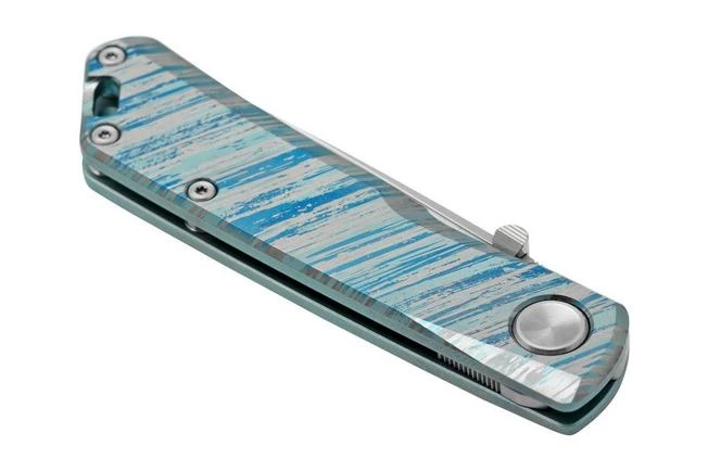 The Real Steel Luna Boost Titanium Wind of Change is a beautiful pocket knife, designed by Jakub Wieczorkiewicz of Poltergeist Designs. This version of the Luna Boost has a titanium handle engraved with a beautiful blue design. Really nicely done!