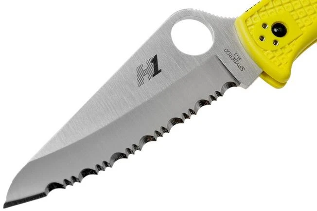 The Spyderco Pacific Salt 2 Yellow C91SYL2 serrated is a practical pocket knife for everyone working in maritime surroundings or who loves spending time there. The blade is namely completely stainless. Stainless because it is made from H1-steel. This is a type of steel in which all carbon is replaced by nitrogen. The result is a guaranteed stainless type of knife steel that retains its sharpness well. This version of the Pacific Salt 2 is enhanced with a serrated edge. This edge is made to cut high-fibre materials such a rope.